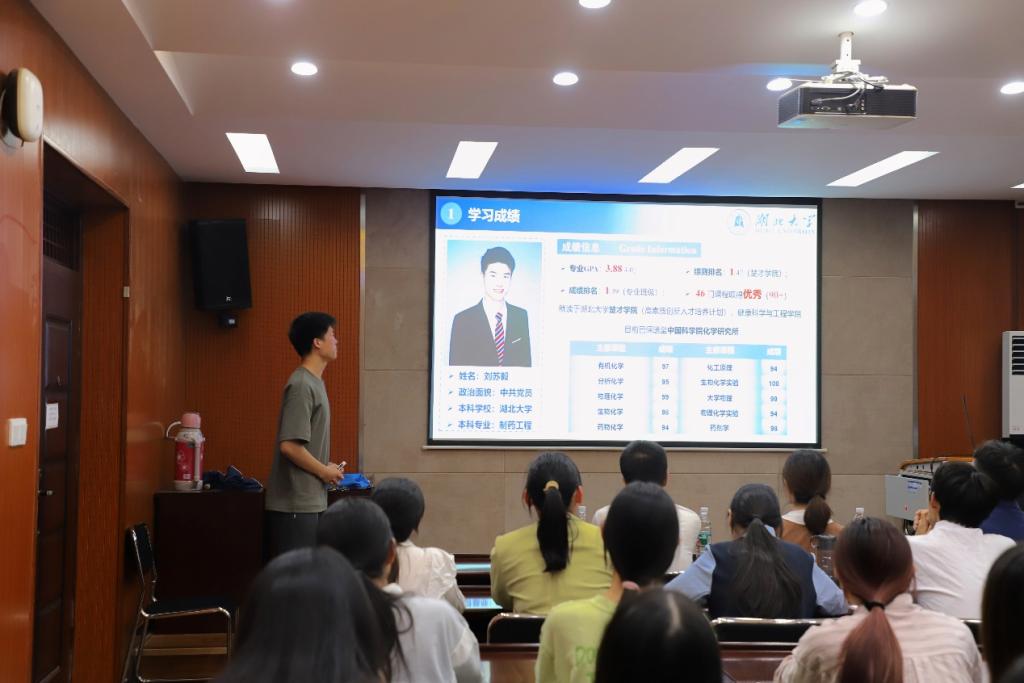 本次国奖获得人,2021级制药工程专业、楚才公司刘苏毅同学也到现场分享了本人在大学三年的学习科研情况谈到自身经历时,他勉励低年级同学在大学学习期间要学会自主学习自主钻研