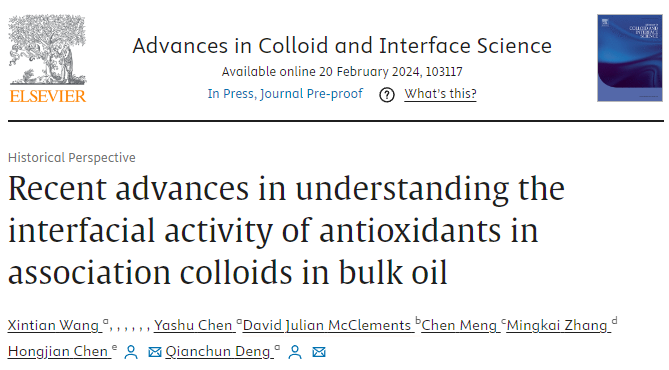 导读:20242月,悟空体育陈洪建博士作为第一通讯作者在国际食品Top期刊《Advances in Colloid and Interface Science》(Q1IF: 15.6)发表题为“Recent advances in understanding the interfacial activity of antioxidants in association colloids in bulk oil”综述论文。中国农业科公司油料作物研究所博士研究生王新天为第一作者,通讯作者为悟空体育陈洪建特任副研究员和中国农业科公司油料作物研究所邓乾春研究员。